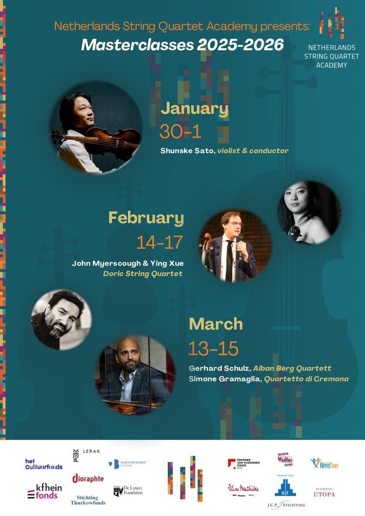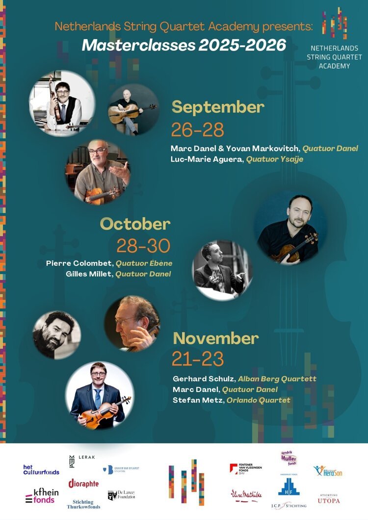 In het weekeinde van 26-28 september vindt het eerste NSKA Masterclass-weekeinde van het seizoen plaats met als docenten Luc-Marie Aguera (Quatuor Ysaÿe), Yovan Markovitch en Marc Danel (Quatuor Danel). Een compleet overzicht van de masterclasses 2025-26 vindt u in deze nieuwsbrief, na de concertagenda of op de website van NSKA: www.nska.nl