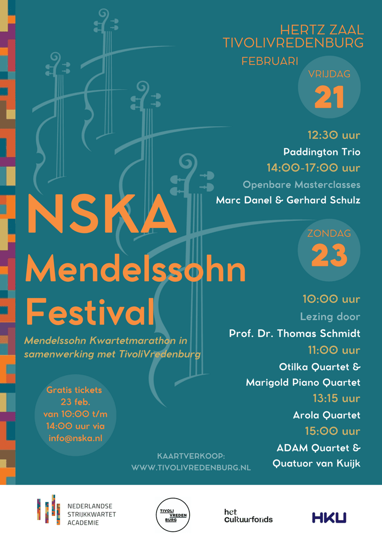 In samenwerking met Tivoli Vredenburg presenteert de Nederlandse Strijkkwartet Academie (NSKA) van 21 t/m 23 februari 2025 een festival rond Felix Mendelssohn. Hiernaast worden alle strijkkwartetten van Felix Mendelssohn-Bartholdy (1809-1847) in één weekend uitgevoerd door Quatuor van Kuijk alsmede het Octet voor strijkers samen met het ADAM Quartet, postacademisch kwartet NSKA. Ensembles in opleiding bij de NSKA voeren op zondag 23 februari een programma met vier concerten rond Mendelssohn uit, ingeleid met een lezing en gepresenteerd door Mendelssohn-specialist Prof. Dr. Schmidt, Professor of Music, University Manchester.