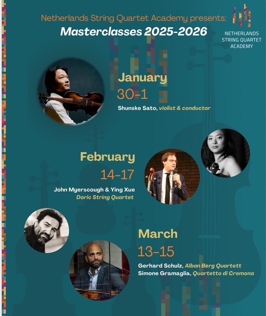 De komende drie maanden staan in het teken van drie internationale Masterclass-weekeinden waarin repertoire vanuit verschillende specialisaties op het programma staat: van 30 januari t/m 1 februari is violist en dirigent Shunske Sato (voorheen concertmeester bij de Nederlandse Bachvereniging) te gast, terzijde gestaan door artistiek leider Marc Danel. Van 14 t/m 16 februari verzorgen John Myerscough en Ying Xue van het Londense Doric String Quartet en Yovan Markevitch (Quatuor Danel), masterclasses en van 13 t/m 15 maart Gerhard Schulz (Alban Berg Quartett) en Simone Gramaglia (Quartetto di Cremona).