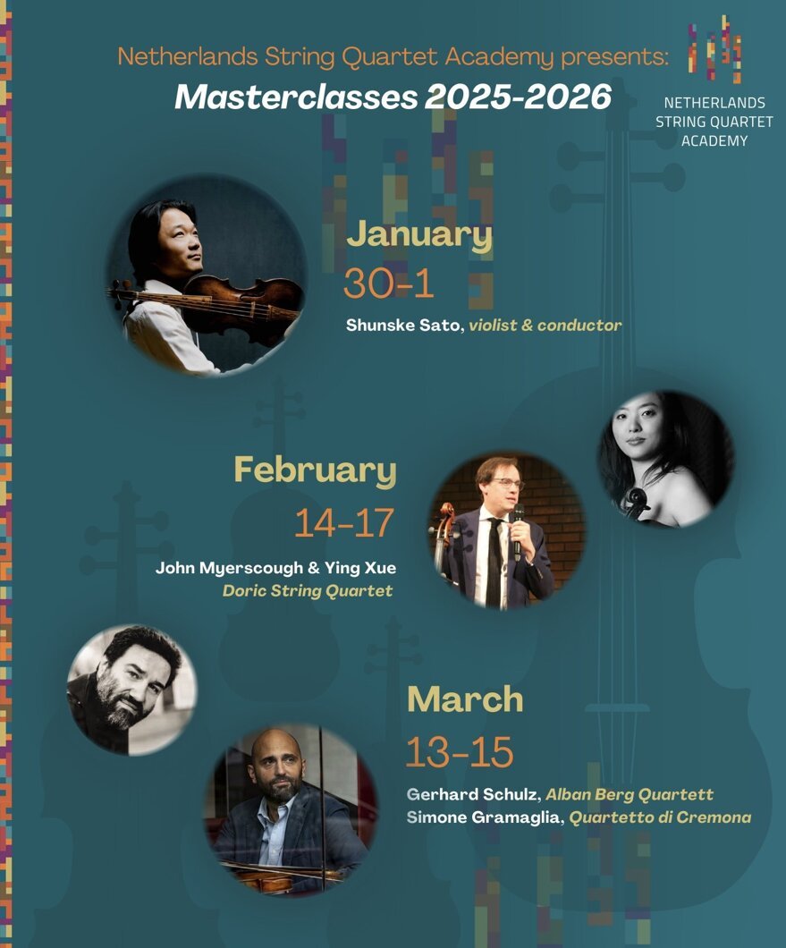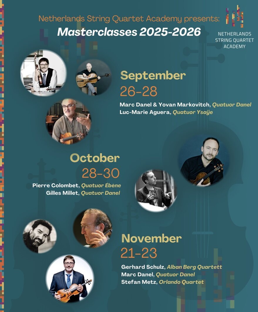 In deze Nieuwsbrief kijken we graag met u vooruit naar het nieuwe academische jaar 2025-26 met Masterclasses door o.m. Pierre Colombet (Quatuor Ébène), John Myerscough en Ying Xue (Doric String Quartet), Gerhard Schulz (Alban Berg Quartett), Shunske Sato (violist en dirigent) en Marc Danel (Quatuor Danel). Ook grondlegger van de NSKA, Stefan Metz zal in november aanwezig zijn om masterclasses te geven.